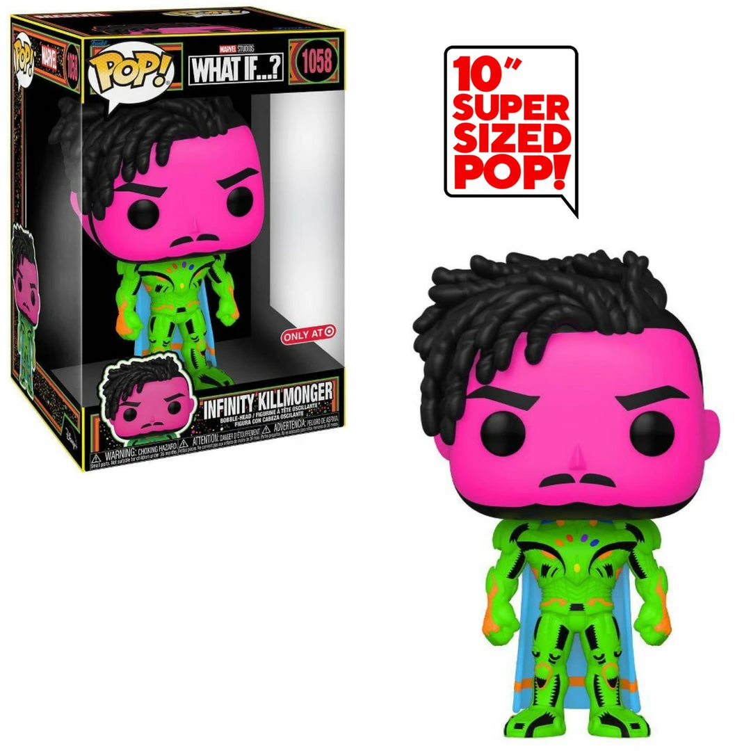 We also have limited quantities of the 10″ Super-Sized BLACK LIGHT Infinity Killmonger Exclusive! Please note: because of the size of the box it may have minor imperfections. Our Boxes DO have the Target Sticker.