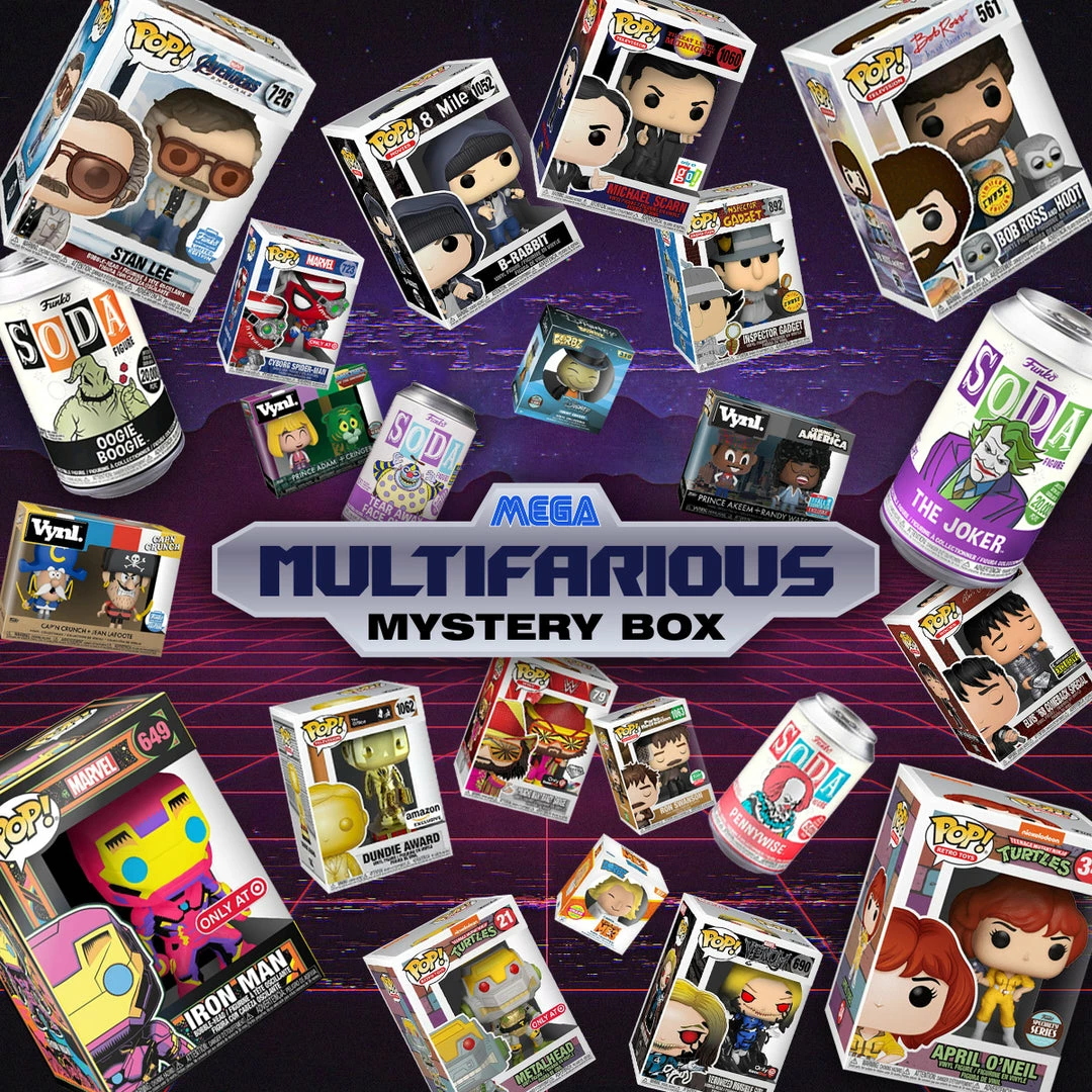 So this round have 50 total Mystery Boxes! This is a unique box! Inside each Box will be a “Multifarious” of Funko Products. THERE ARE 5 TOTAL ITEMS IN THIS MYSTERY BOX! There 2 POPS INSIDE one brand new common and one Exclusive, Grail or Chase. Also one Funko Soda Can with possible Chase, one Vynl 2-Pack and One Dorbz! Those will have the chance at Exclusives and Chases as well! Each item will be bubble wrapped or put into sorters, so you have no idea what it is until you pull open or unwrap that 1st item!