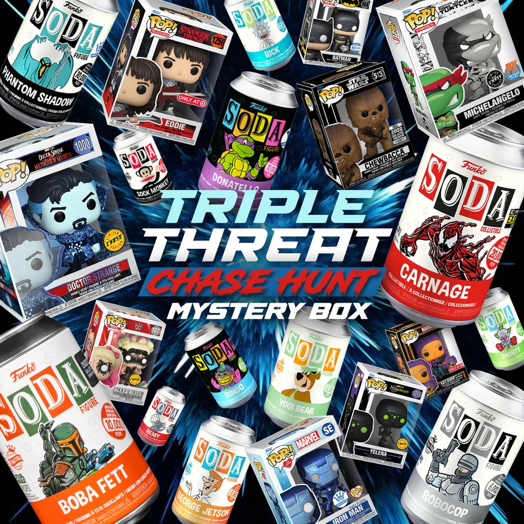 This round will have 100 total Mystery Boxes! This is a Mystery Box first for us, something completely new! There are 3 ITEMS INSIDE, bubble wrapped and covered in tissue paper, so you have no idea what it is until you pull out that 1st item! This Mystery Box has 2 Pops and 1 Funko Soda Can! That’s right, a Triple Threat: ONE NEW COMMON POP, ONE EXCLUSIVE OR CHASE POP PLUS ONE FUNKO SODA CAN 😱 Each Common will be a full price new common, no Sale Pops or clearance. Each Exclusive will be a retailer or convention Exclusive or a CHASE! Each Funko Soda Can also has a 1 in 6 chance at a CHASE variant which makes this Mystery Box so fun and exciting!